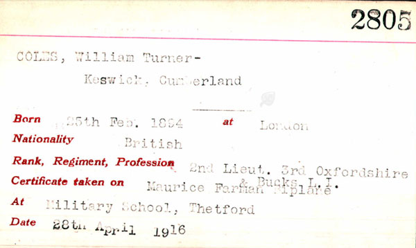 1915 Apr 23 Commissioned 2nd Lt. 3rd Battalion, The Oxfordshire and Buckinghamshire Light Infantry, Temporary Second Lieutenant William Turner Coles, from l0th (Service) Battalion, The Leicestershire Regiment, to be Second Lieutenant (on probation). Dated 23rd April, 1915