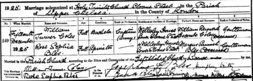 1925 Dec 15 Married in London to Rose Sophia Bles