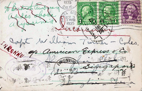 1935 Oct. 3 envelope from Santa Monica, California to Captain William Turner-Coles in Shanghai (22.10) redirected to Singapore (4.11, with American Express receiving d.s.), then to Addis Ababa, Abyssinia via Aden (20.11) but held up in French Somali Coast (31.12) due to closure of the inland mail route caused by the Italian-Abyssinian War, bearing U.S. 1c. pair and 3c., cancelled by duplex, with original handwritten letter from Turner-Coles who had an illustrious career with the R.A.F. in WWI, where his plane was shot down and he was taken prisoner, coincidentally being re-united with his German captor in Shanghai years later.