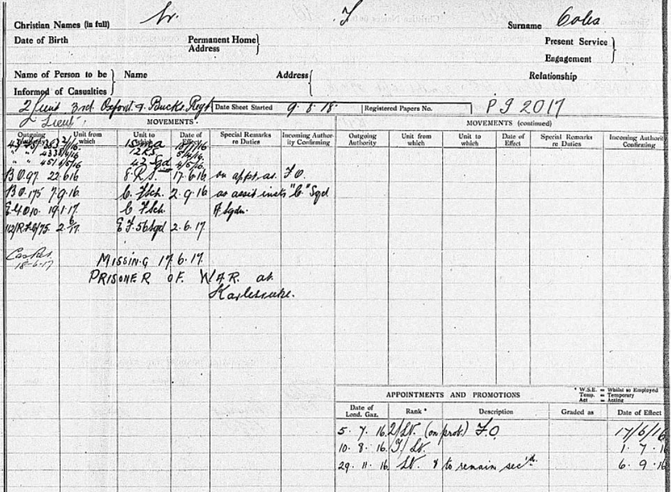 his patrol was attacked by 18-20 enemy aircraft and Coles was shot down by German ace Fritz Krebs of Jasta 6. (or Hans Pollandt ) The casualty report reads, ‘Pilot left aerodrome 8 a.m. to go on patrol & was last seen engaged with E.A. over Hanbourin, fate unknown.’ No. 56 Squadron lost two men that day - Lieutenants Coles and Spearpoint - both became prisoners-of-war. Coles was repatriated to England on 30 December 1918.