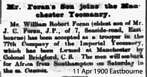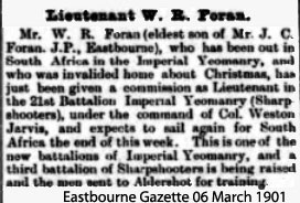 1902 Apr 22. Somerset Light Infantry. Lieutenant William Robert Foran, from 21st Battalion the Imperial Yeomanry, in succession to Lieutenant J. A. Tbicknesse, promoted
