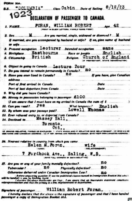 1923 Arrives for Lecture Tour in Canada Address is as on MIC