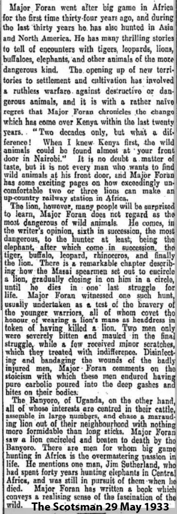 1904 He traveled from Johannesburg to Mombasa, Kenya, and then to the newly founded city of Nairobi to buy land for farming. While in Nairobi, Foran was recruited by the British East Africa Police, becoming one of its six original officers. Foran distinguished himself as a big game hunter and wrote numerous articles and books based on his adventures, including Kill or Be Killed: The Rambling Reminiscences of an Amateur Hunter, published in 1933, which includes stories about fellow big game hunters W. D. M. Bell and Chauncey Hugh Stigand.