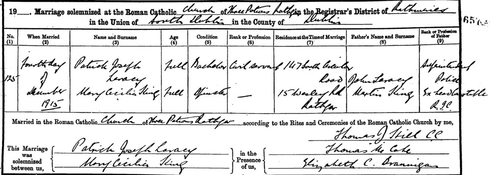 1915 Dec 4. Married Mary Cecilia King in Dublin