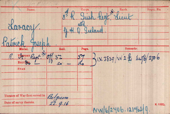 Mr. Patrick J. Laracy, M.B.E. Highfield Road, Rathgar, who has died, aged 78, was a former Assistant Accountant in the G.P.O. He retired in April 1947. During the first World War he served with the Third Royal Irish Regiment, with the rank of Lieutenant, in Flanders and fought on the Somme. He was wounded in March, 1917, and lost a leg.