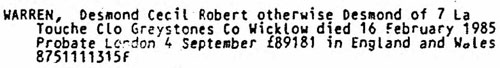 1985 Feb 16. Died at 7 La Touche Close, Greystones, Wicklow, Ireland