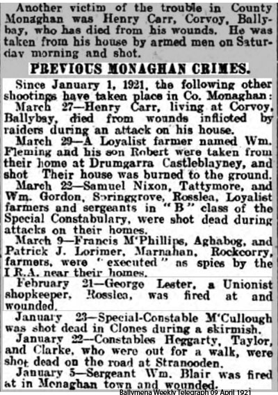 IRA Witness Statement Our Intelligence, about mid March, 1921, intercepted. a letter passing through the post, addressed to the 0/C .Military Barracks, Monaghan, in which the writer, a man named Harry Carr, stated that there were a number of other members of the Tullycorbett Company who should be arrested. We sent a few Volunteers to interview this man, posing as British military. Carr was asked how he could be so definite as to who were members of the local Company. He took his visitors to the door and showed them the Volunteer Drill Hall a short distance from them and said, "Many a night I was there peeping through the window when drilling was taking place". This man a was shot as a spy on Good Friday night 1921.