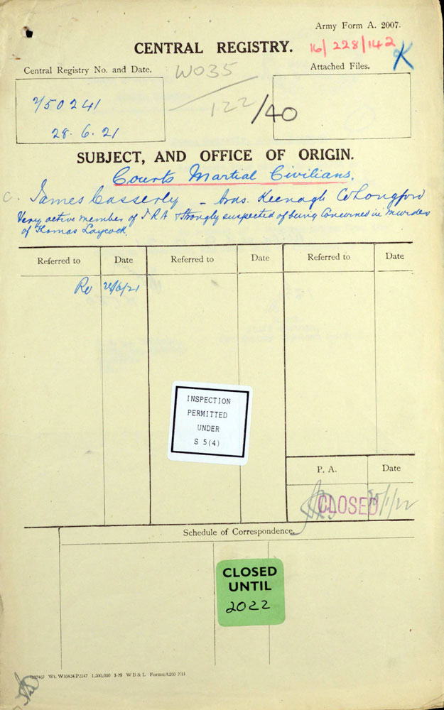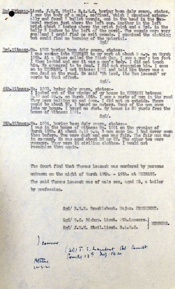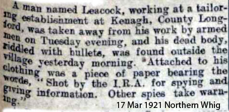 It is believed from a taped interview quoted in Coleman - Longford and the Irish Revolution, that the IRA had found evidence of Leacock sending information to the British, when the IRA made a number of raids on the mails.One can see from the British inquiry that the men who picked Leacock up were interested in his handwriting.