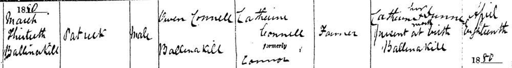 1880 Mar 13. Born Kings Co No not this man , he is single with same parents in 1911 census. I cannot find right Patrick O'Connell to fit all the clues