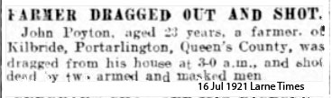 Newspaper reports say two armed, masked men dragged him from his bed at 3 a.m. and shot him. He was ex-RIC. It is difficult to know if he was killed because he had been in the RIC for a short period (2 weeks), or whether it was because he socialised with local RIC.