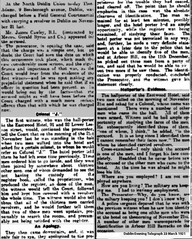 In connection with the Bloody Sunday operations Paddy O'Connor and myself and about 8-to others were detailed to proceed either to Eastwood Hotel, Leeson Street, and shoot a British Intelligence Officer there by the name of Lieut. -Colonel Jennings. That morning on the 21st November the party entered the hotel in question, took it over and asked for Lieut. -Colonel Jennings. The Registrar of the hotel said he was not residing there. we searched the office books but could not find his name in them. O'Connor and myself then searched the bedrooms but failed to locate him. We then withdrew our men and dismissed individually. All got safely away with their guns
