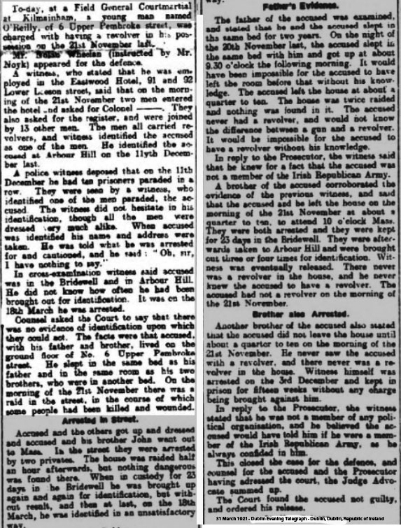 On the eve of Bloody Sunday, Company Commander Christy Byrne selected nine of us from his Company and gave us an idea of the work that we were to be engaged in on the following morning. We were to go to the Eastwood Hotel in Leeson Street. We were given the name of a British Major who was stopping at that hotel. We were told that he was an Intelligence Officer and that he was to be shot, and that the operation was to take place at 9 a.m. the following day - Sunday - and that Section Leader Bennet was to take charge. On the morning of the 21st November we assembled individually outside the hotel in question. We walked into the hotel in a body and Bennet approached the Manageress and asked forhe number of the British Major's room. She was not co-operative and we saw that she was getting signals from the Boots behind us. Evidently he was suspicious of us from the start. Three of us grabbed the Boots and made him take us to the Manager. The Manager gave us the number of the room, but said that the Major hadn't come into the hotel that night. We went to the room and found it was empty. The Boots evidently got into a state of panic and told us that there were twelve flying officers staying there and that if we wanted them he would direct us to their rooms. By this time the remainder of our party had withdrawn and we consulted amongst ourselves as to what we should do. We decided we had no instructions regarding procedure and we all withdrew. The Boots1 whose name I cannot now recall, gave evidence subsequently at a courtmartial and identified a man as having been one of our party. The man he identified received ten years penal servitude.