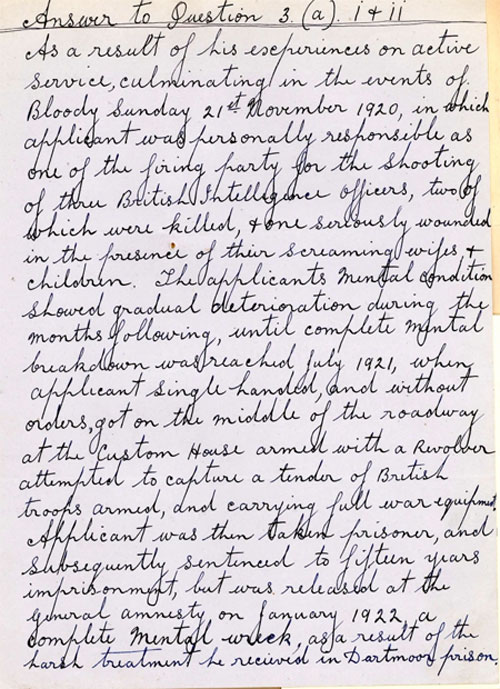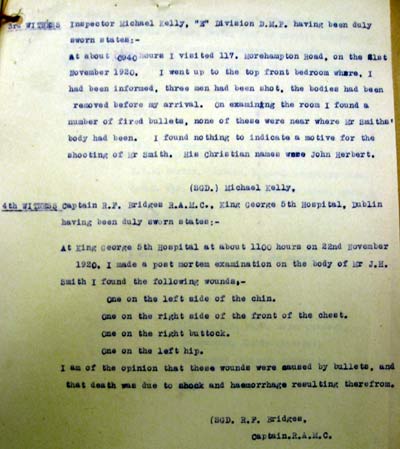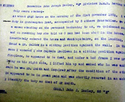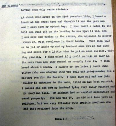 Mrs Smith testified that to the inquiry I saw some men coming up the stairs, who appeared to number about 20, with revolvers in their hands. They then told me to put my hands up and my husband came out on the landing and asked for a little time to put on some clothes, which they granted. I then asked if I could go into my baby in the next room and they pushed me roughly into it. I then heard about 8 shots. A minute or two later I heard John Caldow (who was staying with us) call out Kate (meaning his sister) run for the doctor. I then came out and saw John Caldow in [the] entrance to the room, lying on his back wounded. I passed him and saw my husband lying very badly wounded and Mr MacClean dead. My husband had no regular occupation and owned property. His age was 47. He did not take part in politics, but was very friendly with Captain MacLean who had just resigned from the army.