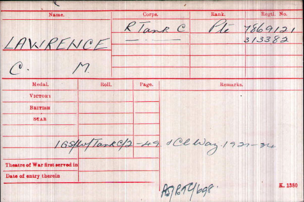 Carew's batman was Private Marcus Cecil Lawrence 313382 Tank Corps. From Mountain Ash Glamorgan, Wales.