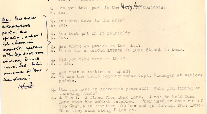 We attended at the Typographical Societies Offices in Middle Gardiner St. on Saturday night, the 20th, for final briefing on the ( job ) to be carried out the following morning. I was detailed as I.O. to the Squad to execute Lieutenants Gerald Ame's and Bennett at 38 Upper Mount St. The only information I had as to their whereabouts at this address was a recently captured letter to Ames and in which Bennett was mentioned. At 10 o,clock on that night I went to Upper Mount St. to locate the house. Before leaving I arranged with the Squad leader, Vincent Byrne, where to meet the following morning. The time arranged for the jobs throughout the city was to be 9 a.m. on the 21st. We gained access to number 38 without any difficulty. I asked a maid where was Mr. Bennett and Mr. Ame's. When she told me, we tried the door of Bennett's room which was locked. Herbert Conroy, a member of the Squad, had a sledge hammer under his coat and wanted to break in the door. I would not let him but instructed the maid to knock on the door which was opened by Bennett. We took him to a return room where Ame's was sleeping, and having asked the squad for as much time as possible, as I was interested principally in the papers these I.O. might have, they were then executed in Ame's room. In my anxiety to make a thorough search I was unaware that the squad had left and, hearing some shooting in the street, I walked to the door of Bennett's room. I heard a noise and looking down the hall I saw a British soldier outside the room where the two bodies were. I wheeled round to shoot but the soldier jumped into the room. At the same time, Tom Ennis, who was shooting across the street from the door step of 38, called on me to come on.