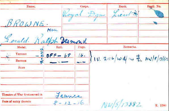 Gerald Ralph Desmond Browne, 7th Earl of Kenmare was educated at Oratory School, South Kensington, London, England.2 He gained the rank of Major in the service of the 1st Dragoons.2 He fought in the First World War between 1916 and 1918.2 He was invested as a Officer, Order of the British Empire (O.B.E.) in 1922.2 He succeeded to the title of 5th Baron Kenmare of Killarney, co. Kerry [U.K., 1856] on 20 September 1943.2 He succeeded to the title of 7th Viscount Castlerosse [I., 1801] on 20 September 1943.2 He succeeded to the title of 7th Earl of Kenmare [I., 1801] on 20 September 1943.2 He succeeded to the title of 7th Viscount Kenmare [I., 1798] on 20 September 1943.2 He succeeded to the title of 13th Baronet Browne, of Mohaliffe, co. Kerry [I., 1622] on 20 September 1943.2 He succeeded to the title of 7th Baron Castlerosse [I., 1798] on 20 September 1943.2 On his death, his titles became extinct