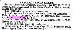 1st Regiment of Dragoons; ADC to the Lieutenant-General and Governor-General of Ireland 1921; OBE 1922