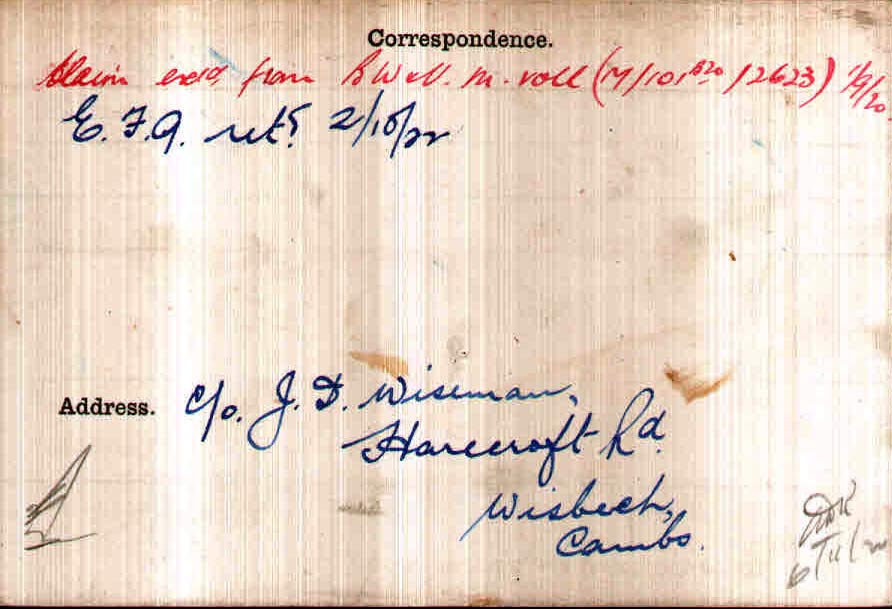1917 Oct-Dec Married at Wisbech, Cambridgeshire, England to Joyce Winifred Wiseman Vol3b, p 1365