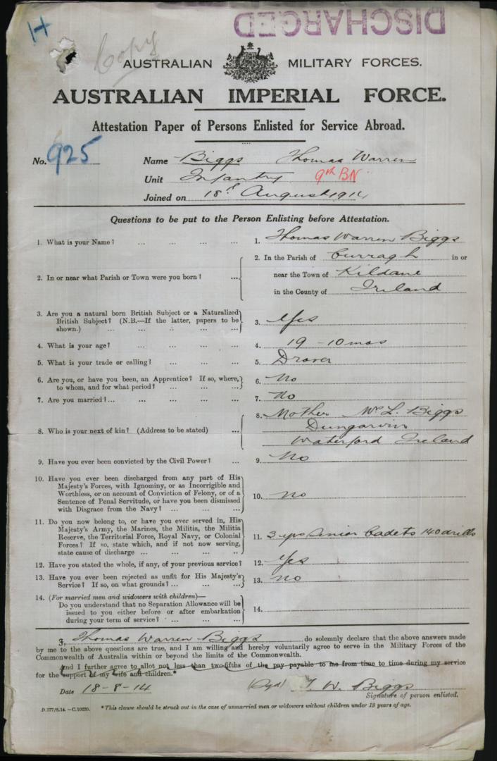 1914 Aug 18. . Private, Australian Army, Battalion 9th Infantry Battallion. Service no 925. Mrs L Biggs, Dungarvin, Waterford, Ireland
