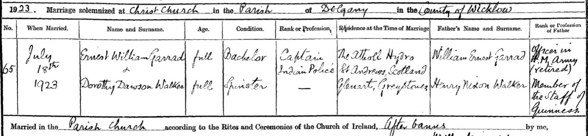 1923 Jul 18. Married in Dublin to Dorothy Dawson Walker. He is now in Indian Police
