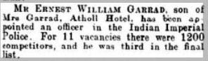 1923 Jul 14.. Appointed to Indian Police. GARRAD, Ernest William, Indian Police (born 9th Apl., 1897). — Joined the service as asst, supt., Punjab , on 12th Nov., 1923 ; offg. supt., July, 1929 ; addl. asst, inspr.genl., Simla, June, 1935.