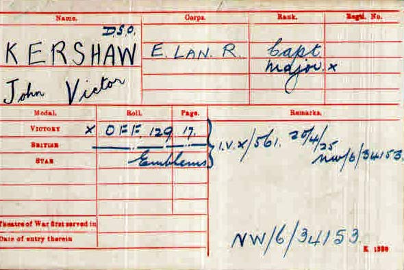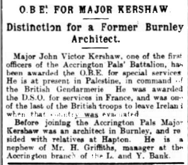 Accrington Pals researchers have found Kershaw to be the mystery man of the Accrington Pals: wins the DSO for his successful Oppy Wood operation, gains the OBE after the war- and yet he hardly appears in any of the books on the battalion, which is very well documented, and no-one seems to know much about him.