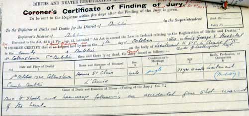 The court of inquiry took evidence and found that Lt L'Amie had been ordered to take a group of men into Dublin to investigate a theft. L'Amie was walking towards the officers' mess, and 3 men were walking 20 yards behind L'Amie. Each stated that heard a single shot saw L'Amie fall. L'Amie was clutching a revolver in his right hand and a single bullet had been fired. One man said L'Amie was walking with a stick in his left hand, and his right hand in his coat pocket. The medical witness stated that death was due to a single bullet to the heart.