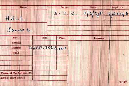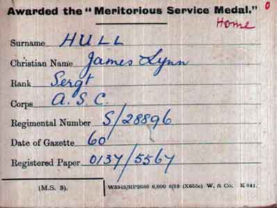 James Lynn Hull's medals came up for sale and now reside in my collection of MSMs. Hull was the soldier from Dublin Castle who ID'd "Molloy". A combination of British War Medal, LS&GC and MSM usually makes an interesting research subject. In this case his "red book" service record survives with the medals. James Hull, born Belfast 1891, enlisted in Dublin in 1910. He served WW1 in Malta (1912-1919) and later Aden and Malta (again). He served a total of nearly 27 years, all in the R.A.S.C. His MSM card records the award for "home service" whilst the London Gazette states it was for service in Malta.