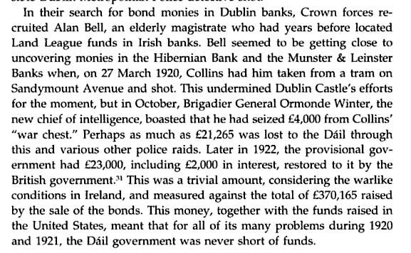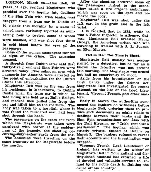 Resident Magistrate Alan Bell, from Banagher, had been tasked by the British to track down Collin's war chest. By the 26th of March 1920, he had successfully confiscated over £71,000 from Sinn Féin's HQ and, by investigating banks throughout the country, was set to seize much more. On that day he was pulled off a tram in south Dublin and shot three times in the head.