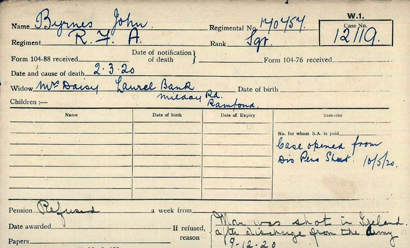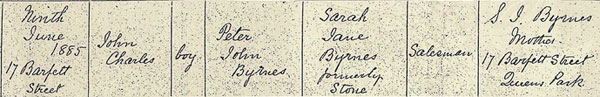 1885 Jun 9. He was born John Charles Byrnes in his parents' home at 17 Barfett Street, Queens Park, London on 9 June 1885. He had two younger brothers and a sister. Both of his parents were English but his grandfather, a naval veteran of the Crimean War and the Indian Mutiny, was an Irishman from County Wexford. Peter Byrnes, his father, was the manager of a china shop in London's Savile Row.