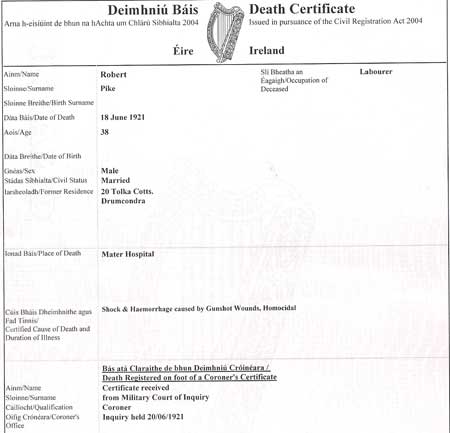 1921 Jun 19. Robert Pike appears to have been executed near Tolka Bridge. This is 5 months after the failed ambush.