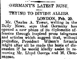 1917 Jan 6 He writes an article from Holland about smuggling on the German border,Written by a friend of Tower's, Thomas Curtain. I tried to "fix it" with the British authorities in Rotterdam, but as they did not know me my progress was slow for a few days. Then I went to Amsterdam to my old newspaper friend, Charles Tower, correspondent for the Daily Mail, a man of broad experience, and in close touch with affairs in Holland, a country which war journalists have grown to look upon as an important link in the news chain between Germany and England. I realised that this move might confirm the suspicions of von Kuhlmann's spies who were on my trail. However, the free air of Holland was making me a little incautious, a little over-confident. "There is the man who is following you," said Tower, as we stepped in the evening from his home on to the brightly lighted street and made our way along the edge of the canals. The tall, round-shouldered German shadowed us through the crowded streets to the Amstel Hotel. Then we shadowed him, while he telephoned for help which came in the form of a persistent Hollander, who insisted in sitting at the table next to us, although it had just been vacated by diners and needed re-arranging, whereas many other tables were entirely free.... In all countries Germany considers certain telephone connections to be of great strategic importance. It is practically impossible to be connected with the British Consulate at Rotterdam, until the "interpreter" is put on. Mr. Tower experiences the same annoyance. Indeed, the Germans are extremely attentive to him, Although he needs only a small flat, since he lives alone, he has to protect himself by hiring the floor above and the floor below, as the Germans are continually trying to get rooms as close to him as possible. The German Government has for years been pouring out money like water to conquer the world.