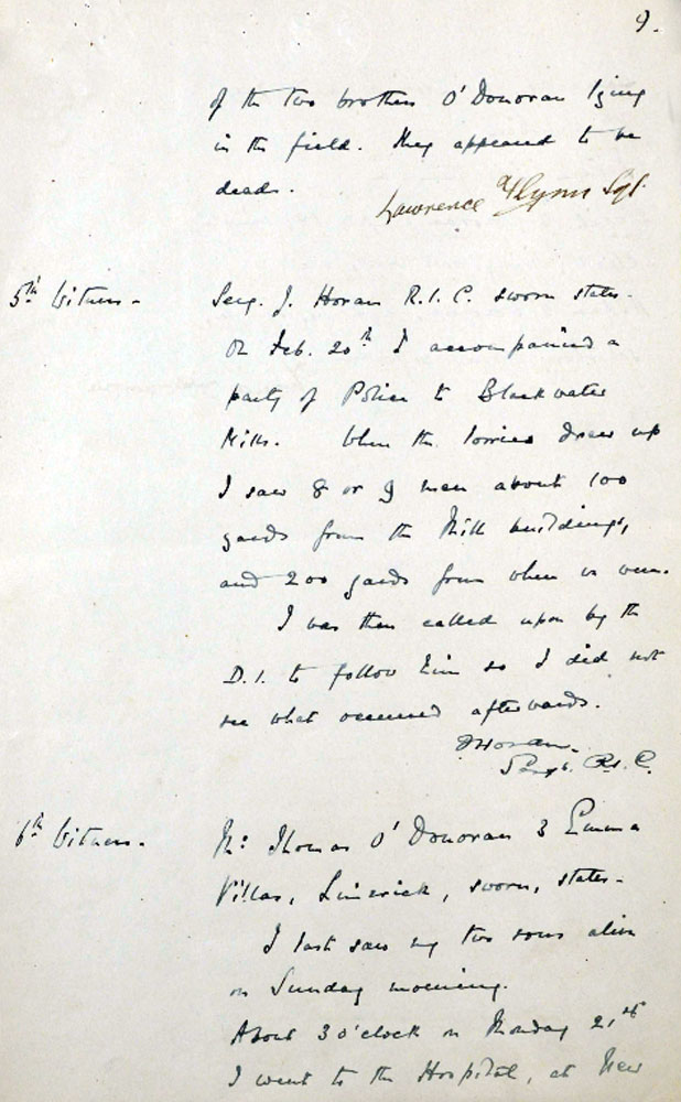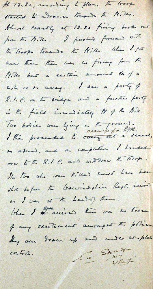 The Police convoy consisted of 2 Crossley tenders and 2 cars, so it was around 25 men. They were under the command of DI Greasley and an Army IO, Capt James Dudley Sturrock . Sturrock says that he got information about the suspicious movements in the Mill, and decided to send a patrol to investigate. He said that when they got there , he saw 7 to 9 men leaving the Mill. And while Greasley and Sturrok were investigating, he heard firing come from the RIC in the tenders under the control of Sgt James Horan and Sgt Lawrence Flynn.