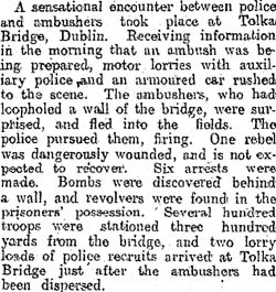 According to one of the IRA men, O'Sullivan (the survivor) , the party left the Binn's Bridge site when it appeared that the Auxiliaries would not be coming their way, and they headed to the Tolka River Bridge in Drumcondra. Shortly after they arrived at the Tolka bridge, the ambushing party was “given away by a Sergeant Singleton of the DMP [Dublin Metropolitan Police]”, and they were surrounded. Others say by Robert Pike. The witness statement of Harry Colley (former Adjutant, IRA Dublin Brigade 1920-21) supports O’Sullivan’s, “they had actually been sent to carry out the ambush at Binn’s Bridge, but for some reason of their own, when they reached the position, moved up beyond Tolka Bridge to Clonturk Park.”