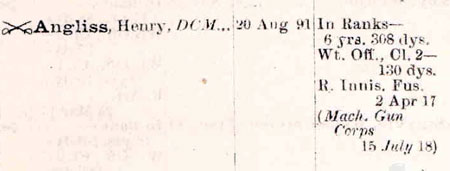 1918 Dec Army List The Royal Inniskilling Fusiliers 1st & 2nd Bn’s 2nd Lieutenant Angliss H; D.C.M., 2 Apr 17 (Employed with Machine Gun Corps)