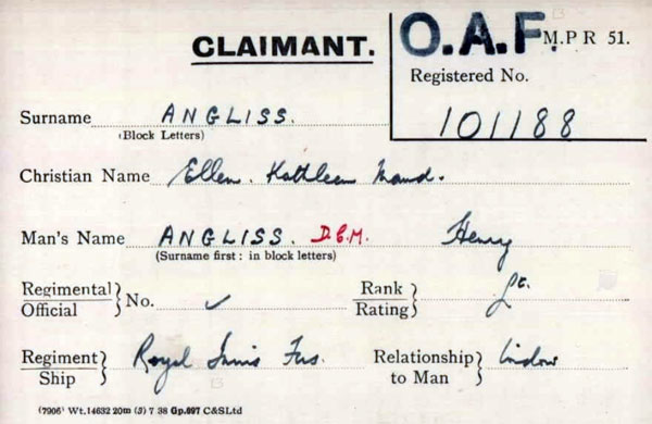 The form filled by his widow, in 1921 records that Henry Angliss's family living at that date were, all at 4 Grafton Place, Gillingham, Kent. Henry Angliss himself would have been 28 in 1921