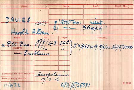 1917 Aug 25. Gazetted MC. T./Capt. Harold Alban Davies, R. W. Fus