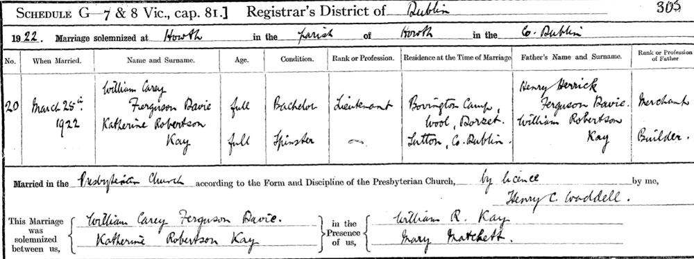 1922 Mar 25 He married in Dublin to Katherine Robertson Kay, daughter of William Robertson Kay.