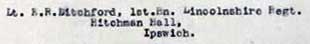 This is a difficult man to find - "R R nor E.R Ditchford" do not exist in Gazette, and "Hitchman Hall" does not exist. However "Hitcham Hall" does exist close to Ipswich. The Problem is that the people there in 1911 census are not his family. Though Frank Grant is a University Coach. Thier address is given as 17 Chesterton Hall Crescent, The Hall, Hitcham, Ipswich, Cambridge. So Hitcham Hall could refer to any address in the village