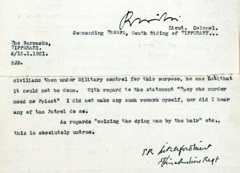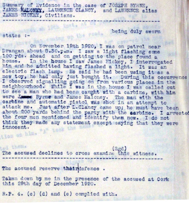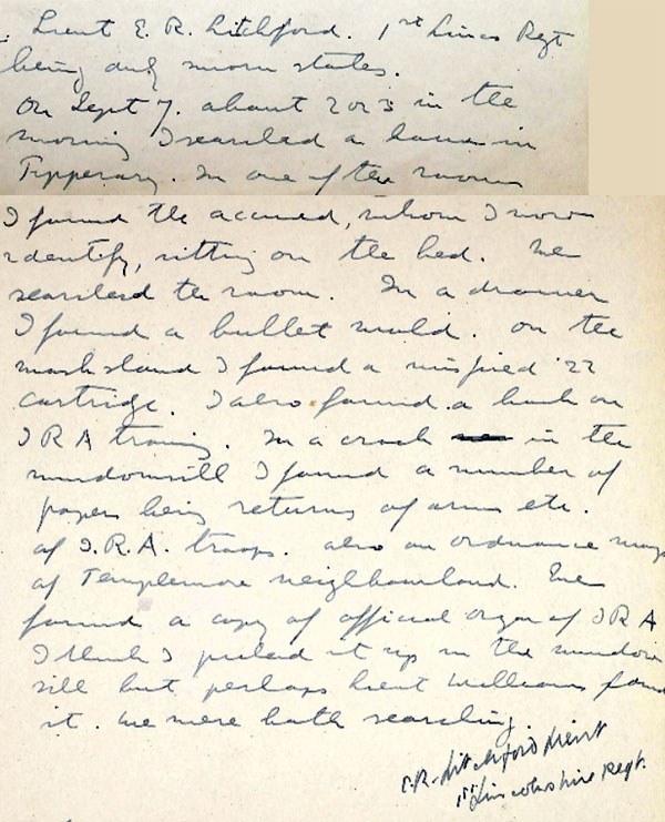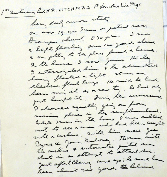 1920 IRA Witness Statement At this time (probably about the autumn of 1920) I was 'on the run' and spent practically all my time with Donovan and some others who were also 'on the run' in the 7th Battalion area. I remember Donovan telling us that he had orders from G.H.Q. to shoot a Lieutenant Litchfield of the British Army who was then stationed in Killenaule, and Donovan in turn gave us orders that if the opportunity ever came our way we were to shoot Litchfield at sight. On a few occasions we went into Killenaule at night and patrolled the streets there but failed to see Lieutenant Litchfield