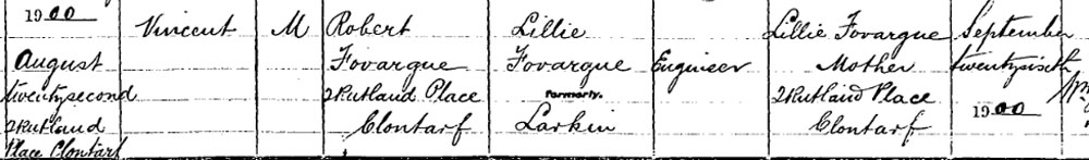 1900 Aug 22. Vincent Fovagrue (sic). Birth registration Dublin North Vol: 2, Page 409