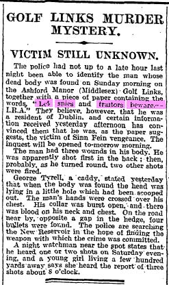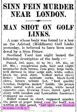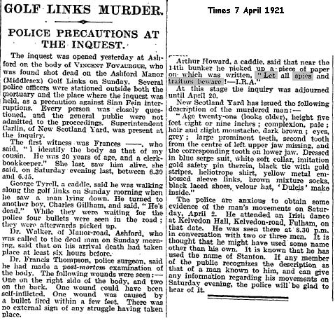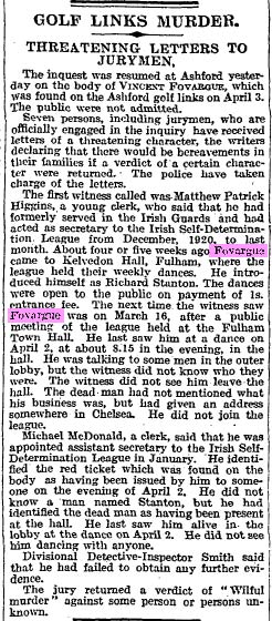 1921 Apr 3. Found murdered on Ashford, Middlesex, Golf Course with little left of his head . The body was identified as Vincent Fovaurgue or Fovargue, alias Richard Stanton.The traditional message 'Spies and traitors beware.' was pinned to his body and there was a rosary in his hands.There is some discrepancy in the accounts as to who actually murdered Fovargue.