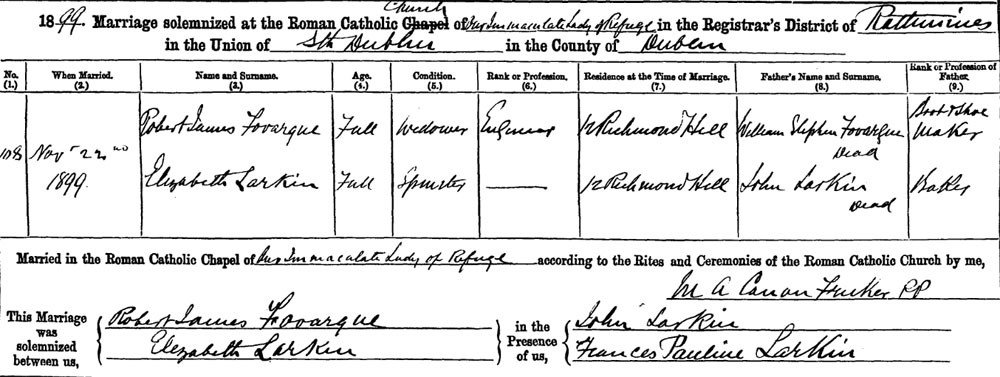 1899 Oct/Dec Marriage of Robert J Fovargue in Dublin to Elizabeth Larkin