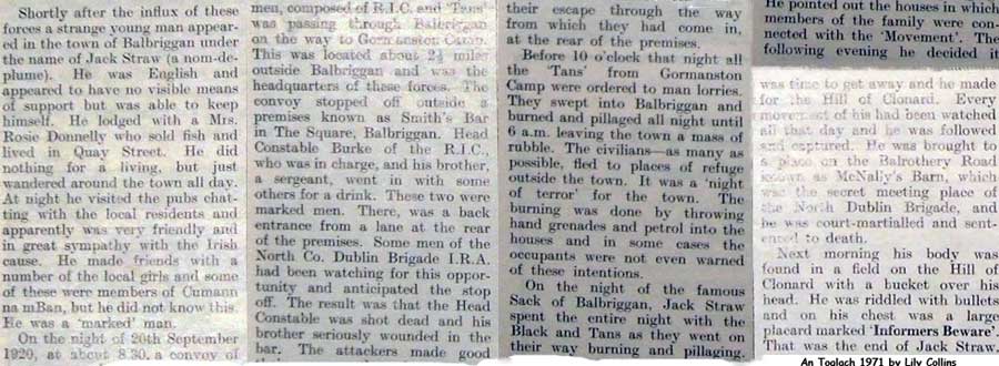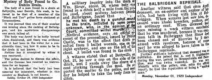 - A man calling himself "William Straw" or "Penstraw" or "Henstraw" lived in Balbriggan for some months before the sack of Balbriggan. One asks the question "why was he in Balbriggan?", the answer presumably was to spy on local IRA men, and it was co-incidental the the events took place (the murder of the policemen) that led to the Sack of Balbriggan.