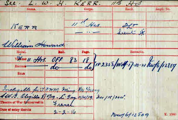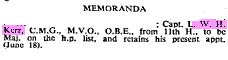 1919 Jul 22 . Lt. L. W. H. Kerr, 11th Hrs., to (be temp, Capt. (without the pay or allces. of that rank) whilst empld. as a Brig. Phye. Trg. Supervisor.