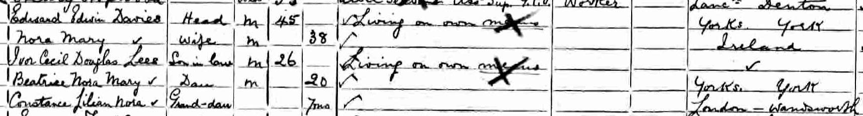 1911 census - meanwhile his sister Gladys is married to Ivor Cecil Duglas Lees, a motor engineer at 35 Fieldhouse Road, Balham, LondonS W. They appear to have been married 1905. This Lees had been earlier married, and I cannot find either his marriage to Gladys nor his death.