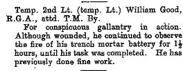 1919 Nov 20. Relinquishes his commissoionTemp. Lt. W. Good, and is granted the rank of Capt