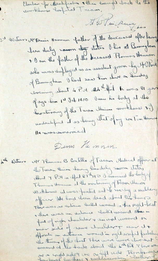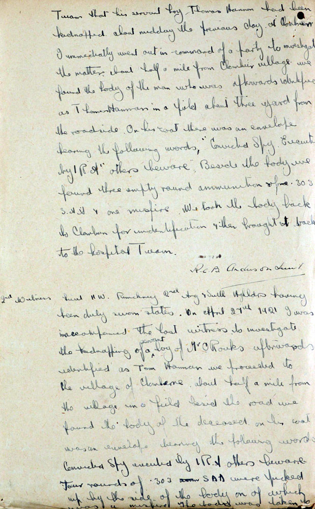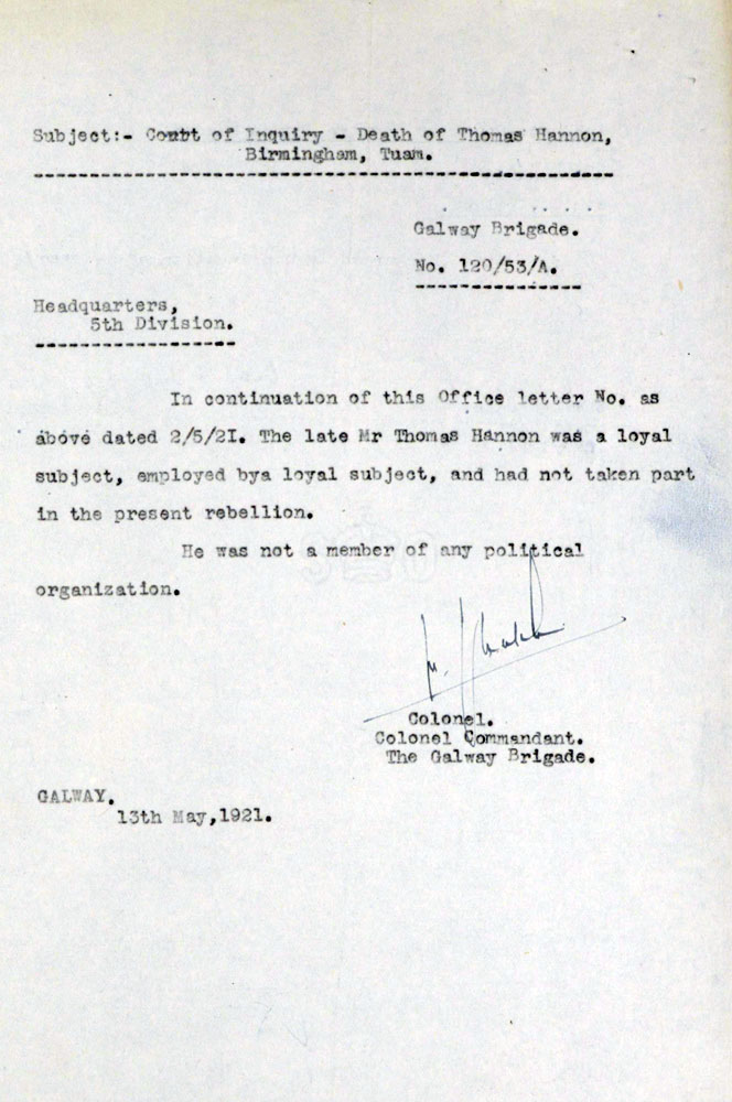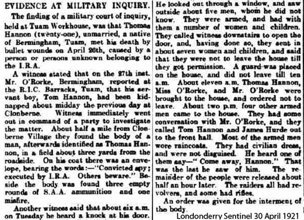 IRA Witness Statement During the day, many people who passed by and saw us had to be detained. They were kept under guard in the house of Charles O'Rourke, a local landlord who had another place at Birmingham, about three miles from Tuam. A man named Thomas Hannon was found in O'Rourke's house. He was an employee of O'Rourke's and usually worked in the place in Birmingham, but just happened to be in Clonbern on that particular day. He had already been sentenced to death by the I.R.A., having been found guilty of giving information to the enemy. Before leaving Clonbern, 'annon was taken to one of the local priests, who ministered to him before his execution. He was executed by shooting. His body was labelled "Spy" and left in a field near the village of Kigalla