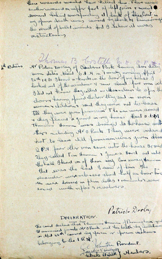 IRA Witness Statement About 10a.m a local landlord named Charles 0'Rourke, who also had a big place at Birmingham near Tuam, arrived at Clonbern accompanied by his daughter and a man named Thomas Hannon. The party were on horseback. Hannon was at the time being sought for by the I.R.A. as he had been found guilty of spying. He was immediately placed under arrest. There was some doubt as to his identity but this was soon cleared up by officers who knew him well. He was held prisoner all day with a number of other people whom we had to detain as a safety measure. The expected lorry of R.I.C. did not come to help Mr.Burke round up his cattle as we had expected. We vacated our positions at dusk .Hannon was taken under escort to the house of Rev. Fr. Waldron, C.C., Clonbern parish, where he was allowed some time to prepare himself for his execution, of which he had been notified earlier in the day by Brigade Commandant Dunleavy. After being spiritually consoled by Fr. Waldron he was taken about half a mile from the parish church, blindfolded and executed by shooting. There was a firing party of seven men.Hannon's body was labelled "Spy" and lef in the field where he fell. I heard afterwards that the verdict at the inquest was six bullets in the heart and one in the neck. [Note - the doctor's report at the inquest does not bear this out]