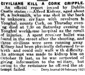 The Crown seem to have gone out of their way to demonstrate that this was an IRA killling. The County Inspectors report said that Kidney had been suspected of giving information about the IRA to the military. See RIC County Inspector’s Report, Cork City and East Riding, Feb. 1921 (CO 904/114, TNA). In addition a pevious attempt had been madeto kidnap him